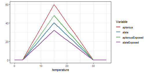 $$ \begin{split} R_0^{apt} &= 50\cdot(1-10/40)\cdot1.6=60\\ R_0^{ala} &= 50\cdot(1-10/40)\cdot1.6\cdot0.67=40.2\\ R_0^{aptE} &= 50\cdot(1-10/40)\cdot1.6\cdot(1-0.2)=48\\ R_0^{alaE} &= 50\cdot(1-10/40)\cdot1.6\cdot0.6\cdot(1-0.2)=32.16 \end{split} $$The usage of AphidNetReproduction is demonstrated in the crop-aphid model.