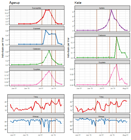 This is a tri-trophic model of the winter wheat-cereal aphid (Sitobion avenae)-fungus (Pandora neoaphidis) system, simulating the dynamics of aphid and fungus from spring until harvest (Saussure et al. 2023). The winter wheat model is rudimentary; the crop is only represented as a growth stage modelled by a regression model fitted to Norwegian growing conditions. Weather data (daily average temperature and maximum relative humidity) drives the model. Optionally, the winter wheat model can be left out, and the crop growth stage instead supplied as an additional column in the weather file.