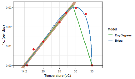 labs(x="Temperature (oC)", y="1/L (per day)")